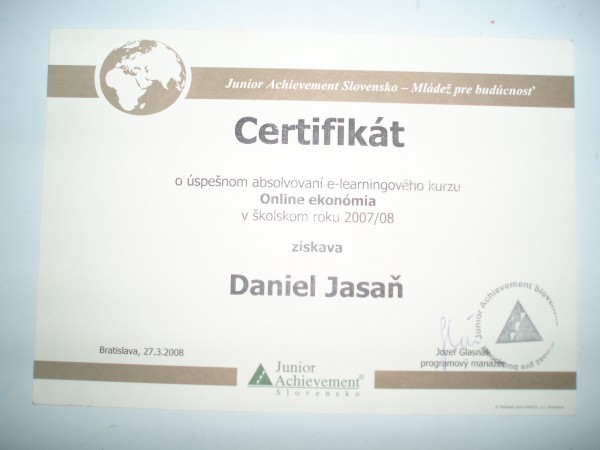 V školskom roku 2007/2008 som sa zúčastnil e-learningového kurzu Online Ekonómia. Tento kurz je organizovaný spoločnosťou Junior Achievment Slovensko - Mládež pre budúcnosť www.jasr.sk.